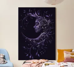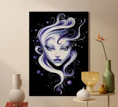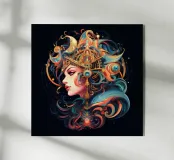 Uno squisito ritratto fantasy che unisce eleganza regale e simbolismo cosmico. La Sovrana Celeste raffigura una potente figura femminile adornata con un copricapo dorato e ornato da motivi lunari e celestiali. Nastri fluenti di turchese, oro e cremisi si intrecciano intorno a lei, creando un'aura radiosa di misticismo e forza. Una celebrazione della femminilità divina, dello stile art nouveau e dell'intricato artigianato digitale.