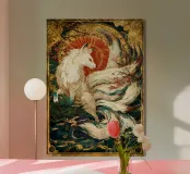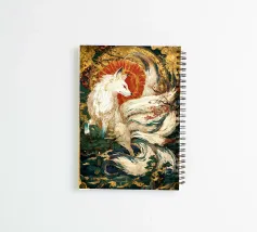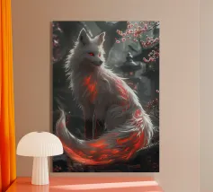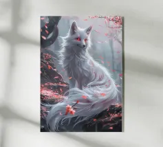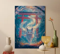 una kitsune abbellisce una scena ukiyo-e d'epoca, con le sue code che scorrono sotto un crepuscolo dorato. I fiori di sakura e la vegetazione lussureggiante aggiungono un ritmo celestiale, con nuvole vorticose incorniciate da un bordo invecchiato con accenti dorati che riecheggiano il passato storico del Giappone.