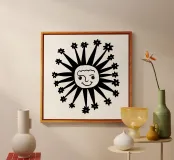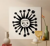 Questo disegno nero e astratto della luna celeste, circondato da stelle scintillanti, conferisce un tocco artistico e tagliente e combina il misticismo del cielo notturno con uno stile contemporaneo e all'avanguardia, rendendolo un pezzo di spicco per qualsiasi spazio e oggetto.