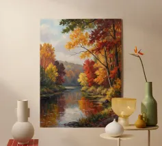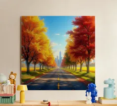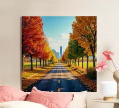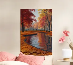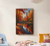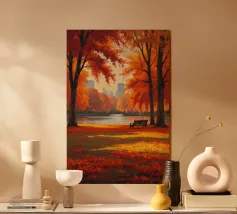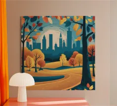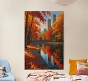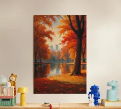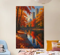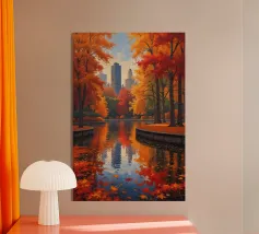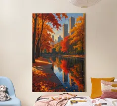Questa accattivante opera d'arte mette in risalto Central Park nel suo splendore autunnale. Foglie dorate e cremisi avvolgono il parco, con riflessi che brillano sull'acqua calma. Lo storico ponte, incastonato tra i vivaci alberi, contrasta splendidamente con gli imponenti grattacieli moderni sullo sfondo. Il gioco di bellezze naturali e architettoniche illustra il fascino unico di New York in autunno, invitando gli spettatori in una pittoresca oasi urbana.