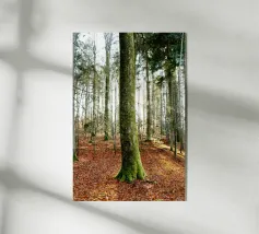 Ceppo di albero in una fitta foresta di conifere plexiglass