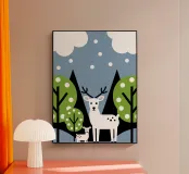 L'illustrazione "Cervo e albero moderno" presenta un grazioso cervo tra alberi ombrosi. L'opera combina elementi naturali tranquillizzanti con un design moderno, creando un'atmosfera pacifica.