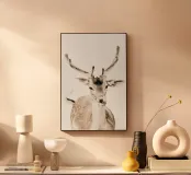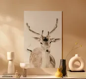 Una fotografia di un bellissimo cervo selvatico che mette in mostra le sue imponenti corna mentre si lecca i baffi.Perfetto per gli amanti degli animali e per chi cerca un tocco di arredamento ispirato alla natura.