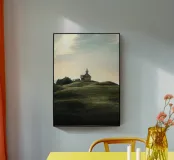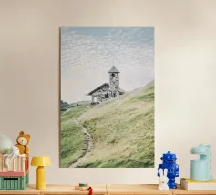 Surrounded by open meadows and swaying grass, it overlooks the valley below with quiet grace. The air is still, filled with the scent of wildflowers and the distant sound of birdsong. The chapel’s simple cross reaches toward the sky, a symbol of serenity and solitude."