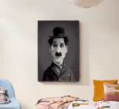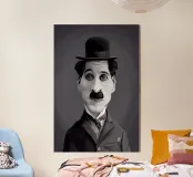 Illustrazione caricaturale umoristica del noto attore americano e hollywoodiano, padre della commedia slapstick, Charlie Chaplin. Una delle caricature realizzate per la serie Celebrity Sunday, in cui un personaggio famoso viene ritratto in un giorno. L'idea è di mostrarli come in una fototessera per avere coerenza.