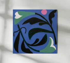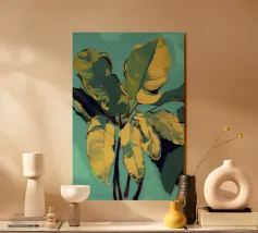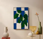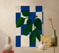 Questa suggestiva stampa d'arte presenta lussureggianti foglie verdi elegantemente collocate su un audace sfondo a scacchi blu e bianchi. La giustapposizione di forme organiche e motivi geometrici crea un'esperienza visiva dinamica, perfetta per aggiungere un tocco di arte moderna ispirata alla natura a qualsiasi spazio.
