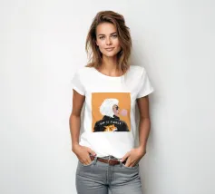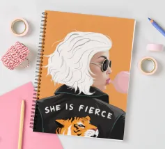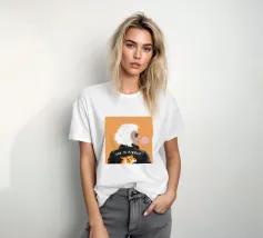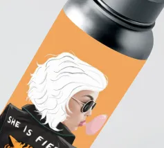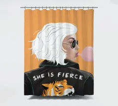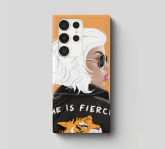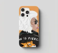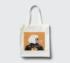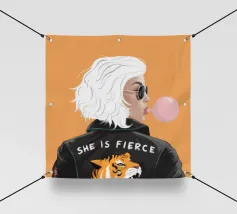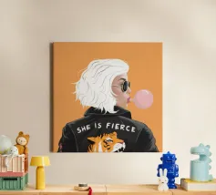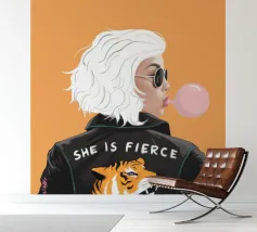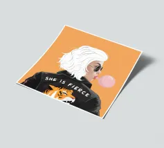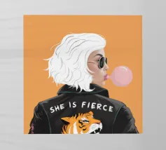 A white-haired woman in black leather jacket with tiger print boldly chews gum under peach sky.
