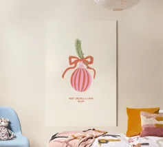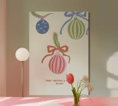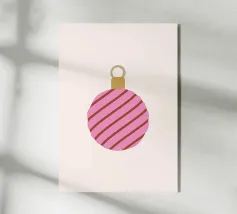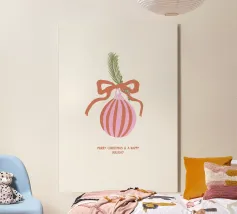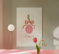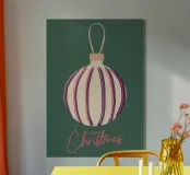 Questo moderno poster natalizio raffigura una pallina di Natale stilizzata con strisce su uno sfondo verde scuro. La scritta "Merry Christmas" conferisce al motivo un'atmosfera calda e festosa. Ideale per il soggiorno, il corridoio o l'ufficio domestico e perfetto per chi ama le decorazioni natalizie semplici e contemporanee.