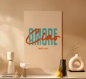 Una poesia d'amore visiva in tre colori e due lingue: La parola "AMORE" si staglia grande e azzurra sullo sfondo, come un silenzioso grido di desiderio. Davanti, "Ciao" cattura lo sguardo in un forte rosso arancio, con un affascinante effetto ombra che crea profondità e movimento. Sotto, quasi come una firma: "studio scusi" in un caldo giallo senape. Lo sfondo beige conferisce al motivo una calma mediterranea, come un tramonto in Liguria.
