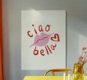 Una stampa "Ciao Bella" divertente e civettuola, con testo rosso e labbra rosa. Giocoso e spensierato, perfetto per aggiungere fascino alla camera da letto, al dormitorio o alla parete della galleria.