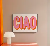 Questo vivace design presenta la parola "Ciao" in un audace carattere di ispirazione retrò con caratteri rosa acceso e un sorprendente contorno arancione.
