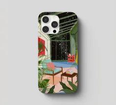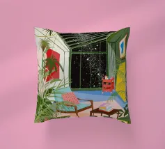 cielo stellato piante piante da interno soggiorno soffitto-finestra poltrona libri tavolo da caffè arte a parete luce-perdite tema cosmico foglie tropicali verde cielo notturno giardino interno spazio relax cuscini colorati atmosfera accogliente arredamento design d'interni