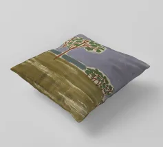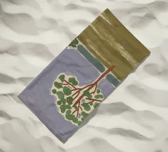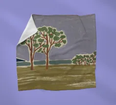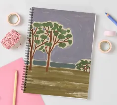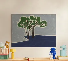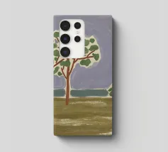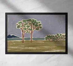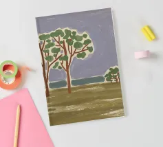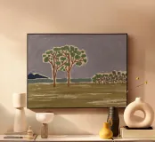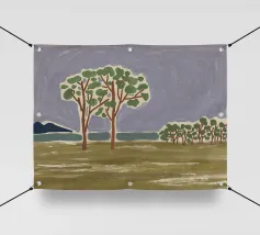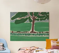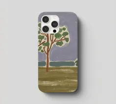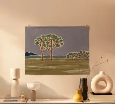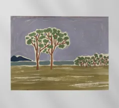 Un paesaggio semplicistico raffigura una fila di alberi con fogliame verde su uno sfondo stilizzato con montagne blu e un cielo grigio e vorticoso. Il primo piano è reso con ampie pennellate di colori terrosi, dando l'impressione di un campo erboso o di un prato.