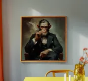 Uno scimpanzé carismatico vestito con un classico smoking nero, seduto con sicurezza su una poltrona mentre fuma un sigaro. L'immagine combina umorismo, surrealismo ed eleganza con uno sfondo atmosferico fumoso.