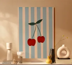 Questa illustrazione minimalista mostra due dolci ciliegie rosse e arancioni su uno sfondo a scacchiera bianca e blu. I colori vivaci e il design semplice porteranno il sapore dell'estate in ogni cucina. Ideale come allegro accento da giardino, questa opera d'arte celebra la bellezza e la freschezza della natura.