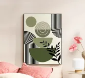 Le forme geometriche nei toni del verde terra sono completate da linee nere decise e da elementi astratti a forma di foglia. La composizione crea un'estetica equilibrata e moderna.