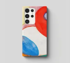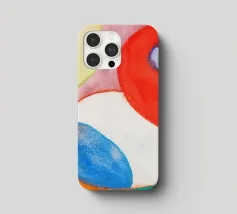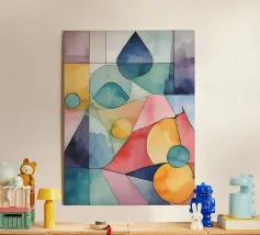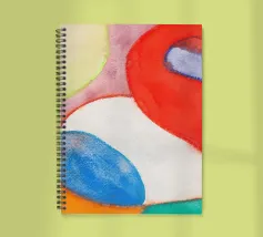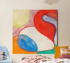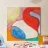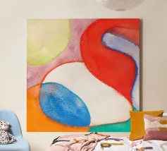 Acquerello astratto con forme organiche in rosso, blu, arancio, verde smeraldo e alcune tonalità pastello