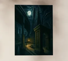 solitudine urbana, paesaggio urbano poetico, disegnato a mano, architettura lunatica, silenzio surreale, notte onirica, arte emotiva, ombre profonde, città ponte, bellezza malinconica, scena misteriosa, schizzo senza tempo