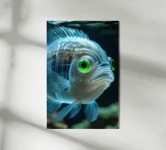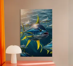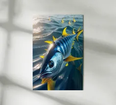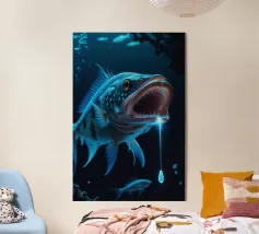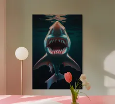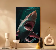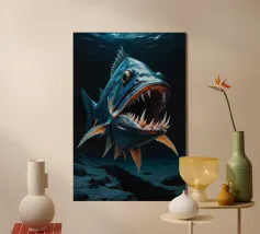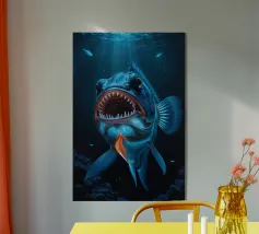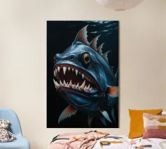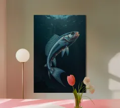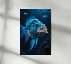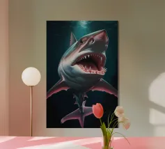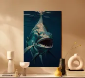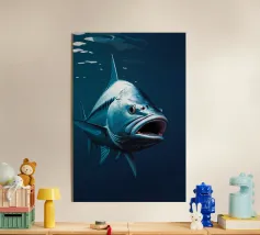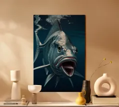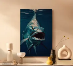 Questo dipinto offre una straordinaria visione ravvicinata di un barracuda, sottolineandone l'espressione feroce e i denti affilati come rasoi. Lo stile iperrealistico dà vita a ogni dettaglio, dal luccichio degli occhi alle creste delle squame. Il blu intenso dell'acqua circostante crea un contrasto drammatico, con sottili increspature e riflessi che esaltano il realismo. Quest'opera d'arte è un tributo al barracuda come potente ed enigmatico predatore degli oceani, che mostra la sua cruda bellezza e il suo dominio nella catena alimentare marina.