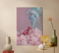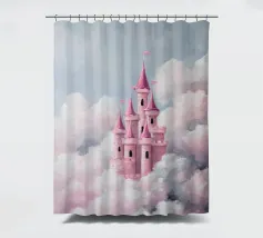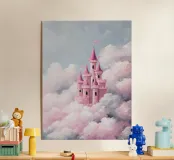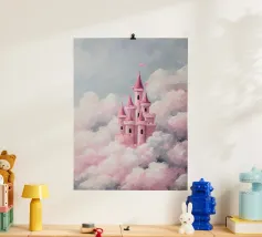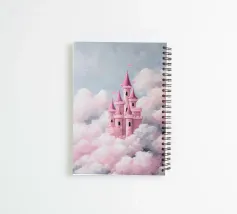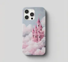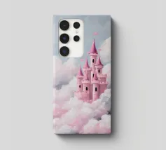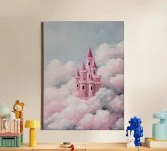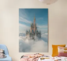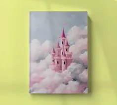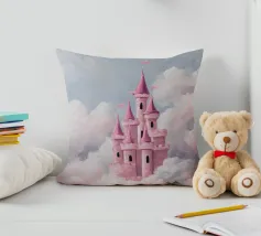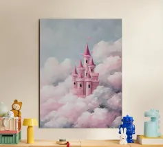 Un castello rosa ispirato alle fiabe che galleggia tra morbide nuvole. Sognante, romantico e pieno di fantasia.