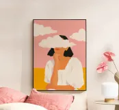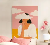 A dreamy and surreal illustration portraying a woman with soft white clouds gently drifting across her eyes. Set against a warm pink sky and golden landscape, the composition blends bold color fields with rich painterly textures to create a striking, contemplative scene.