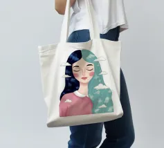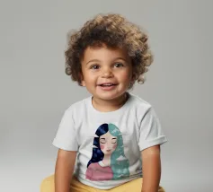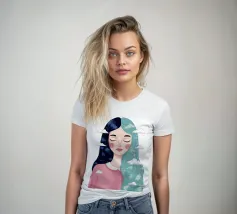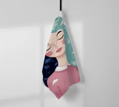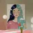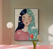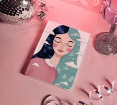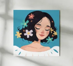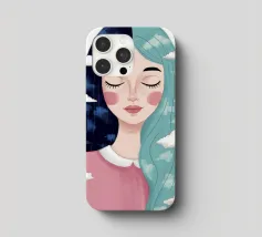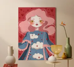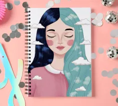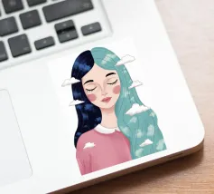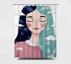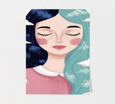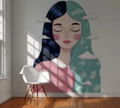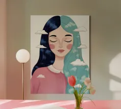 Una donna serena dai capelli blu-neri è raffigurata con nuvole fluttuanti intorno alla testa, che incarnano sogni ad occhi aperti e tranquillità.