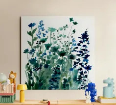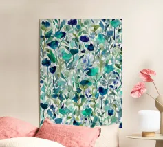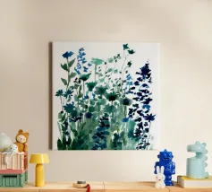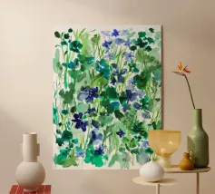 Questo acquerello espressivo cattura un boschetto stratificato di fiori selvatici in un ricco color indaco e verde foresta. La pennellata libera e spontanea evoca movimento e profondità, conferendo alla scena floreale un'eleganza lunatica e naturale.