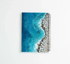 Quest'opera d'arte offre una suggestiva prospettiva aerea di un litorale roccioso che incontra vaste acque azzurre e strutturate. Le pennellate espressive e stratificate catturano il movimento del mare che passa dal turchese luminoso al blu profondo dell'oceano, mentre le pietre chiare formano un bordo ritmico e di base. Piccole figure umane lungo la riva introducono una scala e una narrazione tranquilla, sottolineando il contrasto tra la presenza umana e la forza naturale. La composizione bilancia astrazione e realismo, evocando calma, profondità e contemplazione: ideale per interni contemporanei e stampe d'arte di grande formato.