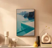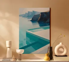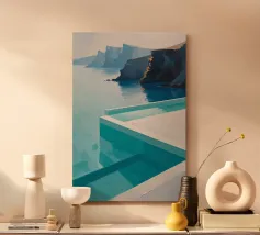 A contemporary oil painting emphasizing minimalist aesthetics shows an infinity pool perfectly reflecting the endless coastal scenery. The white edges of the pool contrast sharply with the tranquil turquoise water and textured cliffs. The still surface mirrors the rocky cliffs, blending artistic abstraction with realism. The backdrop of expansive sky and shoreline immerses the viewer in serenity. The muted tones create a peaceful mood, celebrating the harmony between modern design and natural beauty.