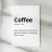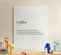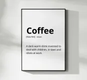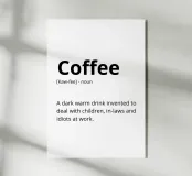 Una definizione umoristica del caffè lo descrive come un rimedio necessario per affrontare le sfide quotidiane come i figli, i suoceri e i colleghi. Il testo imita scherzosamente una voce del dizionario con l'ortografia fonetica e la parte del discorso.