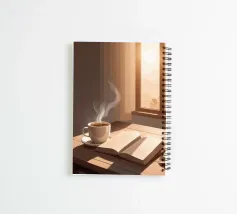 Una rilassante scena minimalista di una tazza di caffè fumante accanto a un libro aperto, immerso nella luce del sole mattutino. Celebra la bellezza delle mattine tranquille e della solitudine riflessiva.
