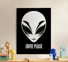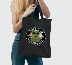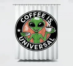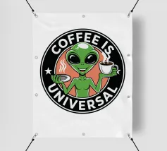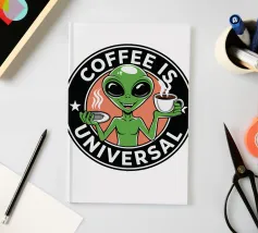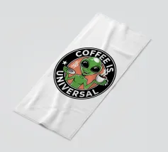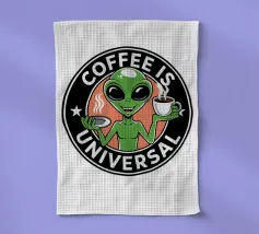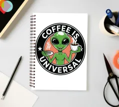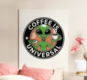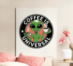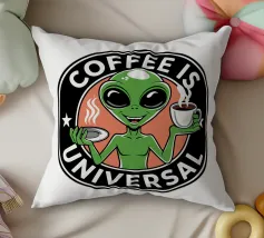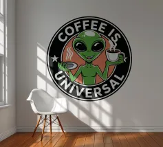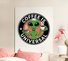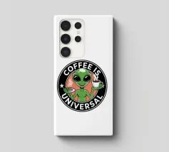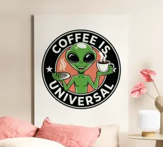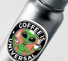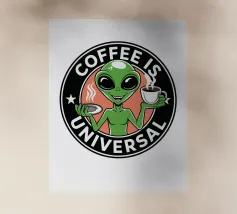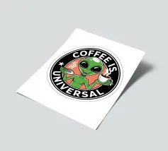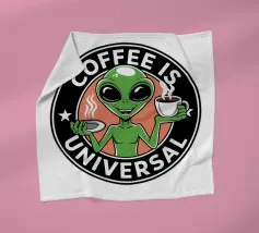 Un simpatico alieno verde tiene in mano una tazza di caffè fumante, suggerendo un legame cosmico con la popolare bevanda. Testo "Il caffè è universale".