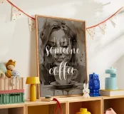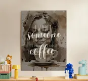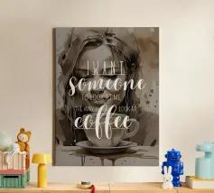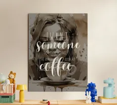 La nostra stampa fine art mostra una scena incantevole: una donna che guarda innamorata una tazzina di caffè, accompagnata dalle sentite parole "Voglio qualcuno che mi guardi come io guardo il caffè" - un messaggio ironico ma pieno d'amore.