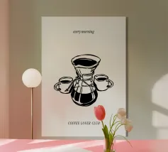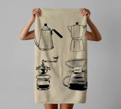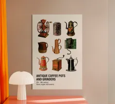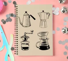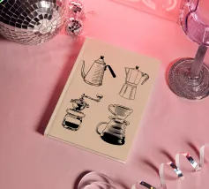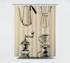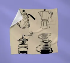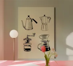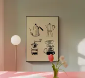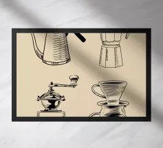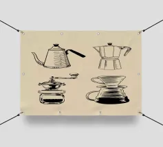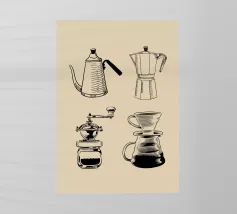 Un disegno minimalista mostra quattro strumenti vintage per la preparazione del caffè: un bollitore a collo d'oca, una caffettiera moka, un macinacaffè a manovella e un gocciolatore. Ogni strumento è illustrato con linee dettagliate su uno sfondo beige.