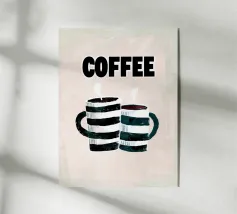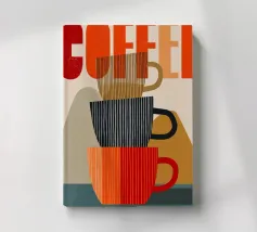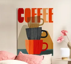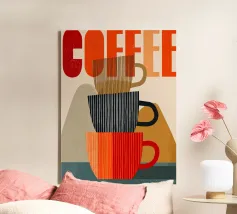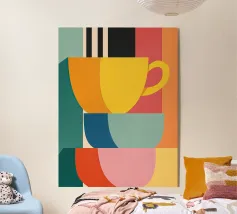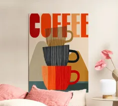 Questa moderna opera d'arte grafica celebra il rito quotidiano del caffè attraverso forme audaci, texture stratificate e toni caldi e terrosi. Le tazze impilate formano una composizione giocosa ma equilibrata, combinando linee verticali con morbide forme geometriche. La tavolozza limitata di terracotta, marrone espresso, crema e carbone profondo evoca calore, comfort e familiarità. Le sottili venature e i dettagli pittorici aggiungono profondità, pur mantenendo un'estetica pulita e contemporanea. La composizione è nostalgica e moderna al tempo stesso, ideale per cucine, bar, angoli caffè o spazi interni curati che apprezzano la semplicità.