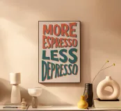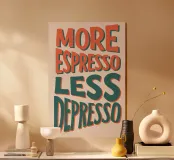 Questo poster tipografico umoristico va al cuore di ogni mattina: "More Espresso, Less Depresso". Con scritte disegnate a mano in un caldo arancione e in un ricco verde su uno sfondo chiaro, è la miscela perfetta di stile e umore. Ideale per la cucina, l'ufficio o come regalo per gli amanti del caffè con senso dell'umorismo - un'idea per risollevarsi in forma di poster.