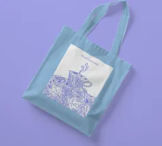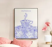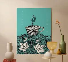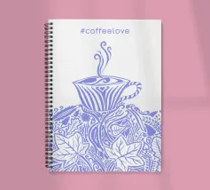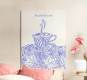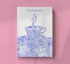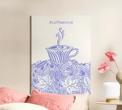 Motivo floreale in silhouette di colore azzurro. In alto una tazza di caffè fumante. Scritta #coffeelove.