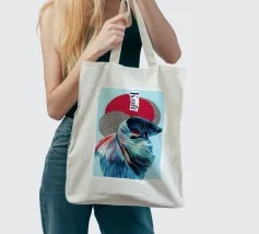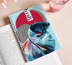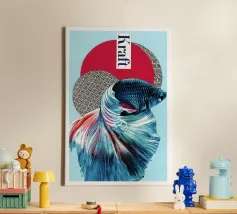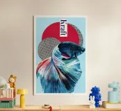 Un collage con un pesce combattente scintillante davanti a forme geometriche. Il forte blu e rosso contrasta con lo sfondo strutturato, mentre la parola "Kraft" sottolinea la dinamica.