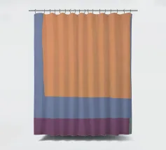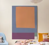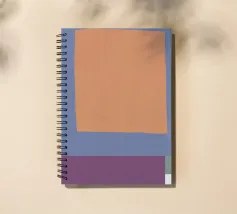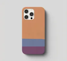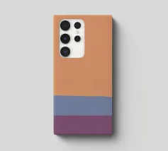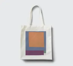 Un grande quadrato color pesca è centrato su uno sfondo grigio-blu, con i bordi leggermente irregolari, che suggeriscono una qualità dipinta a mano. Al di sotto del quadrato, una fascia di viola intenso aggiunge un elemento di contrasto alla base della composizione.