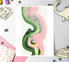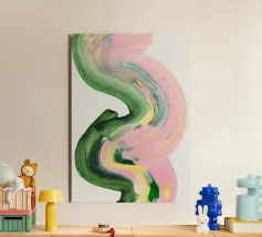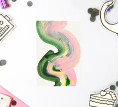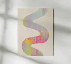 Un'esplosione visiva in cui le forme geometriche pulite incontrano schizzi di vernice brillante. Il contrasto tra tinte piatte e strutturate e spruzzi spontanei crea una tensione gioiosa, come una battaglia tra controllo e caos. Un'opera piena di energia e vitalità.