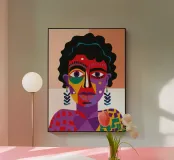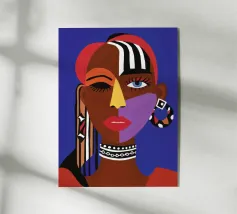 Un potente ritratto astratto di un volto reso in colori primari con linee e motivi audaci ed espressivi, che evocano un senso di energia primordiale e di cruda emozione artistica.