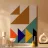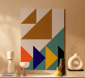 Le forme geometriche sono disposte in uno stile minimalista, con una serie di triangoli colorati. La composizione comprende tonalità di marrone, verde acqua, blu, arancione, giallo e nero, creando un modello visivo dinamico.