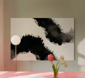 Opera d'arte astratta monocromatica con intense pennellate nere su uno sfondo chiaro. La composizione crea un forte effetto di contrasto ed è perfetta per ambienti minimalisti o interni moderni.
