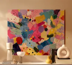 Questo dipinto astratto in acrilico cattura l'energia dinamica della tecnica dell'action painting, ispirata a Pollock. Vibranti schizzi di colore in rosso, giallo, blu e bianco creano linee fluide e motivi complessi che trasmettono movimento e profondità.