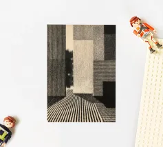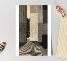 Disegno astratto monocromatico con forme e linee geometriche in nero, bianco e grigio. Strutture verticali a sinistra e al centro, linee orizzontali a destra, su uno sfondo beige chiaro con ombre scure. I contrasti e le texture creano profondità, dinamismo e interesse visivo.
