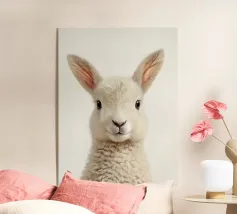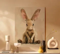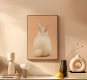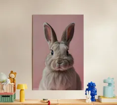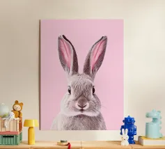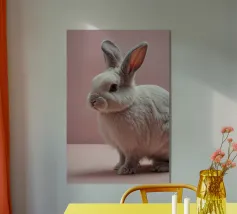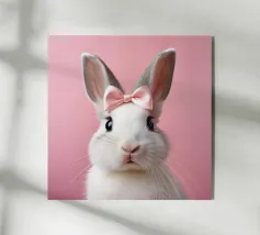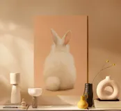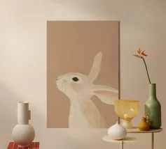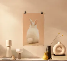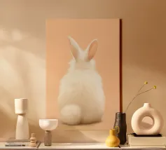 L'opera d'arte mostra un coniglio bianco di spalle su uno sfondo color pesca e cattura l'essenza della Pasqua con un tocco di eleganza e fascino. I tenui colori pastello e i simpatici dettagli aggiungono un'atmosfera rilassante e allegra a qualsiasi stanza.