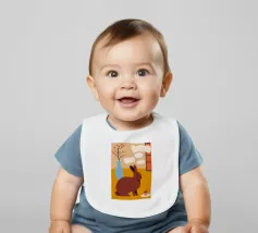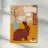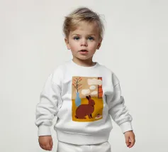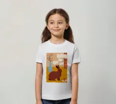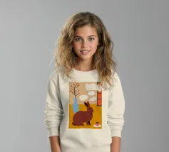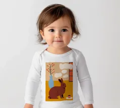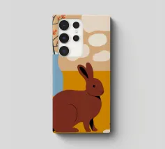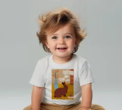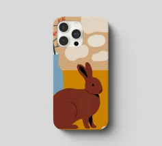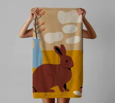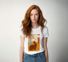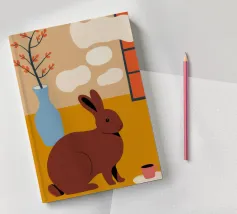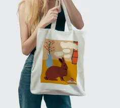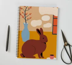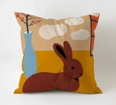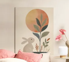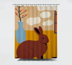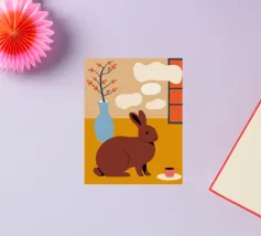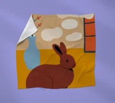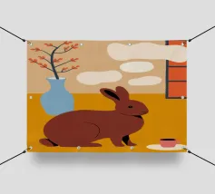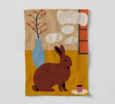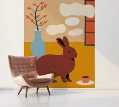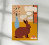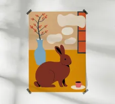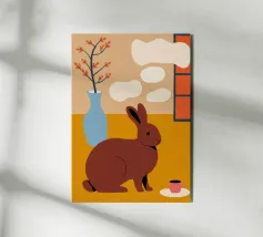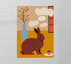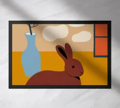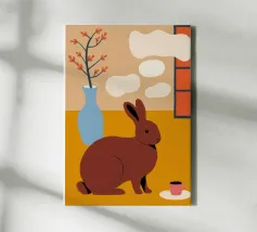 Il dipinto raffigura un coniglio marrone seduto sul pavimento accanto a un vaso blu con rami. Vicino al coniglio c'è una tazza.
