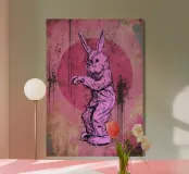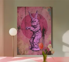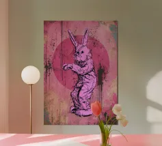 Un'illustrazione espressiva a inchiostro e pennarello di un coniglio umanoide in bilico tra movimento e immobilità. Mescolando l'umorismo surreale con la crudezza del tratto, questo lavoro esplora l'identità, il gioco e la strana tensione tra travestimento e verità.