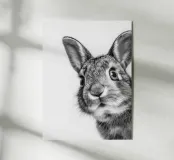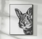 Ein niedliches Porträt eines Hasen mit großen, neugierigen Augen und sanften, schurrhaarigen Ohren. In seinem scwarz-weißen Fell strahlt er auf dem weißen Hintergrund Freude und Neugier aus, perfekt eingefangen in realistischer Tierfotografie.