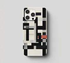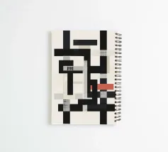 Una composizione astratta contemporanea costruita da barre geometriche nere interconnesse disposte in un ritmo strutturato, simile a una griglia. Morbidi strati neutri e sottili accenti materici aggiungono profondità ed equilibrio, mentre un sobrio accento in terracotta introduce un punto focale di calore.